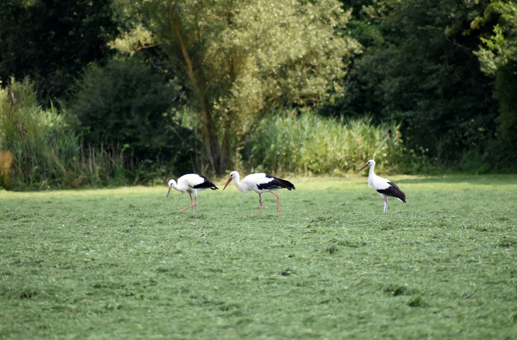 Sie können die Störche gut beobachten, wenn sie auf den frisch gemähten Wiesen oder gepflügtem Acker nach Kleintieren und Insekten suchen.