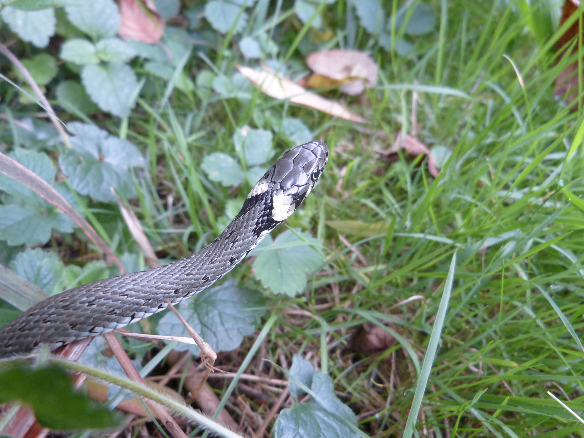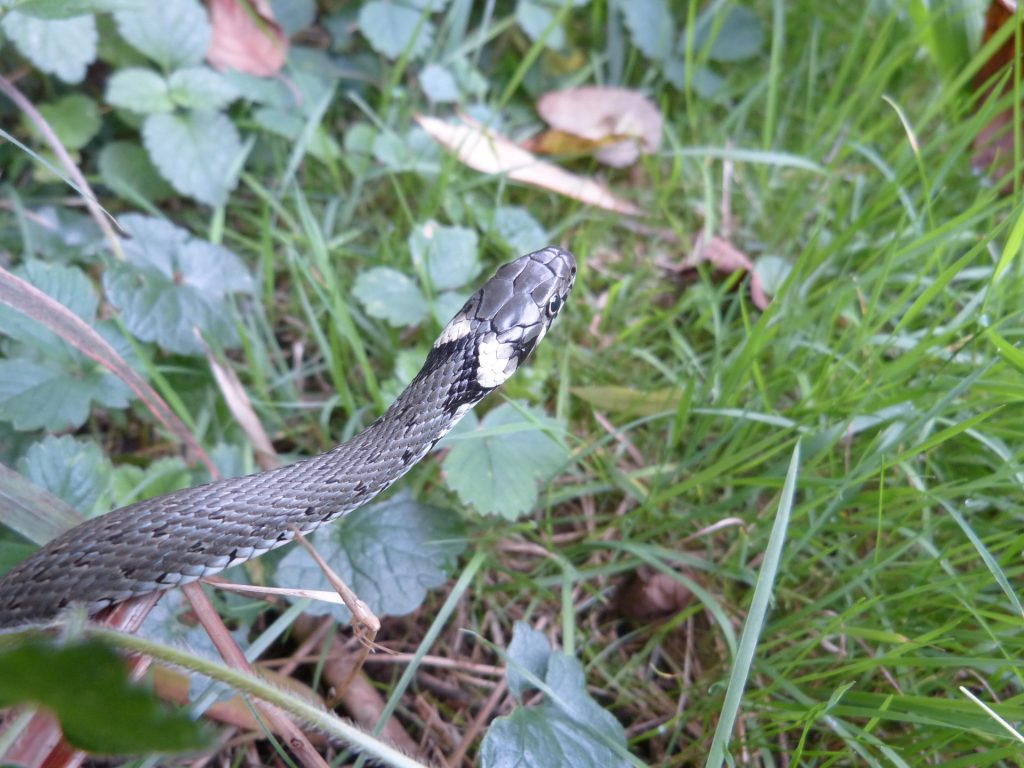 Auch die Ringelnatter ist gelegentlich anzutreffen und auch sie gibt es in verschiedenen Farbvarianten. Gut erkennbar ist sie durch den „Halsring“, der durch die beiden Nackenflecken gebildet wird.